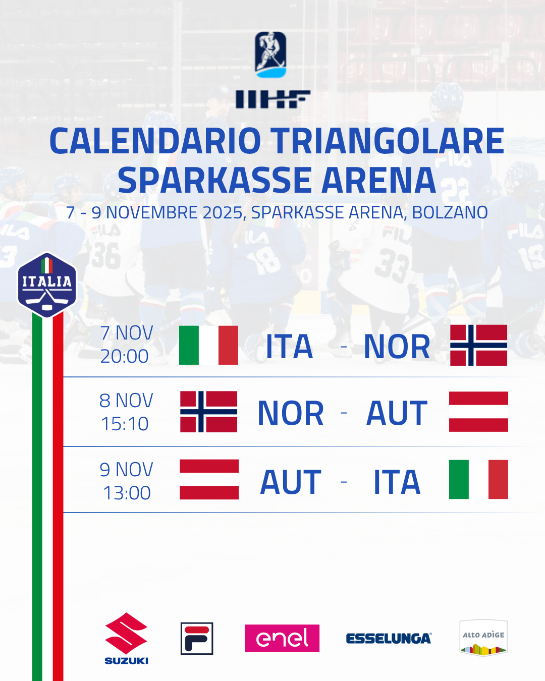 Il triangolare del Palaonda-Sparkasse Arena (le informazioni sui biglietti saranno rese pubbliche nelle prossime settimane) sarà un nuovo importante momento di valutazione per il roster azzurro. Venerdì 7 novembre alle 20.00 sfida alla Norvegia, formazione che lo scorso aprile ha partecipato ai Mondiali Top Division in Repubblica Ceca finendo 4a nel Gruppo B e retrocedendo in Prima Divisione: questo match diventa quindi un antipasto iridato per l’Italia, che a Budapest nell’aprile 2026 ritroverà le “Orse Polari” (questo il nickname della Nazionale). Sabato 8 novembre alle 15.10 saranno norvegesi e austriache a sfidarsi, con le azzure impegnate a fare da spettatrici in questo triangolare novembrino. Infine domenica 9 novembre alle 13.00 è in programma Austria-Italia, con le biancorosse che nel 2025 hanno conquistato la promozione in Top Division e insieme alla Danimarca andranno a sostituire proprio Norvegia e Ungheria nel massimo torneo iridato.