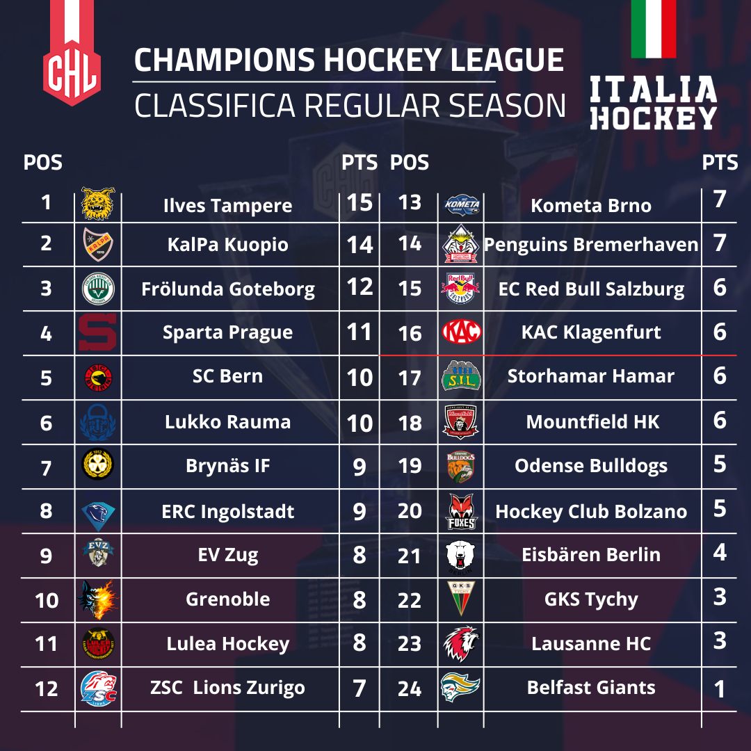 La classifica di Champions Hockey League dopo cinque giornate su sei della prima fase