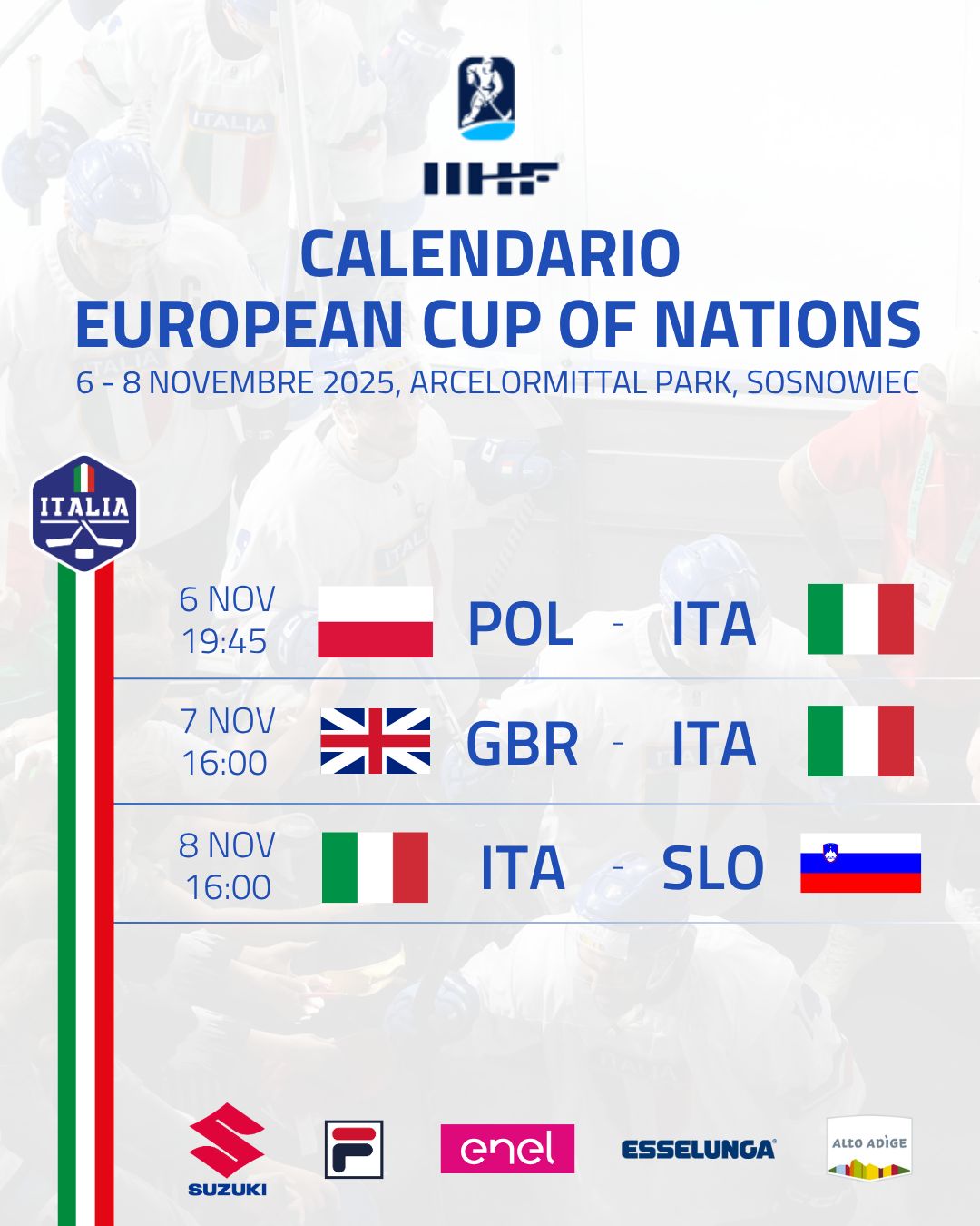 In Polonia la Nazionale italiana arriverà martedì 4 novembre e dopo due giorni di allenamento tra pista e palestra sfiderà giovedì 6 novembre alle 19.45 i padroni di casa sul ghiaccio dell’ArcelorMittal Park. Il giorno seguente alle 16.00 è in programma il match contro la Gran Bretagna per poi andare a chiudere sabato 8 novembre, sempre alle 16.00 contro la Slovenia. Subito in programma quindi tre sfide importanti contro due avversarie dell’ultimo Mondiale di Prima Divisione Gruppo A (battuti 4-1 i polacchi, sconfitta per 1-5 contro i britannici) e la Slovenia, rivale che l’Italia ritroverà nell’ultima e forse decisiva partita del Mondiale Top Division del maggio 2026.