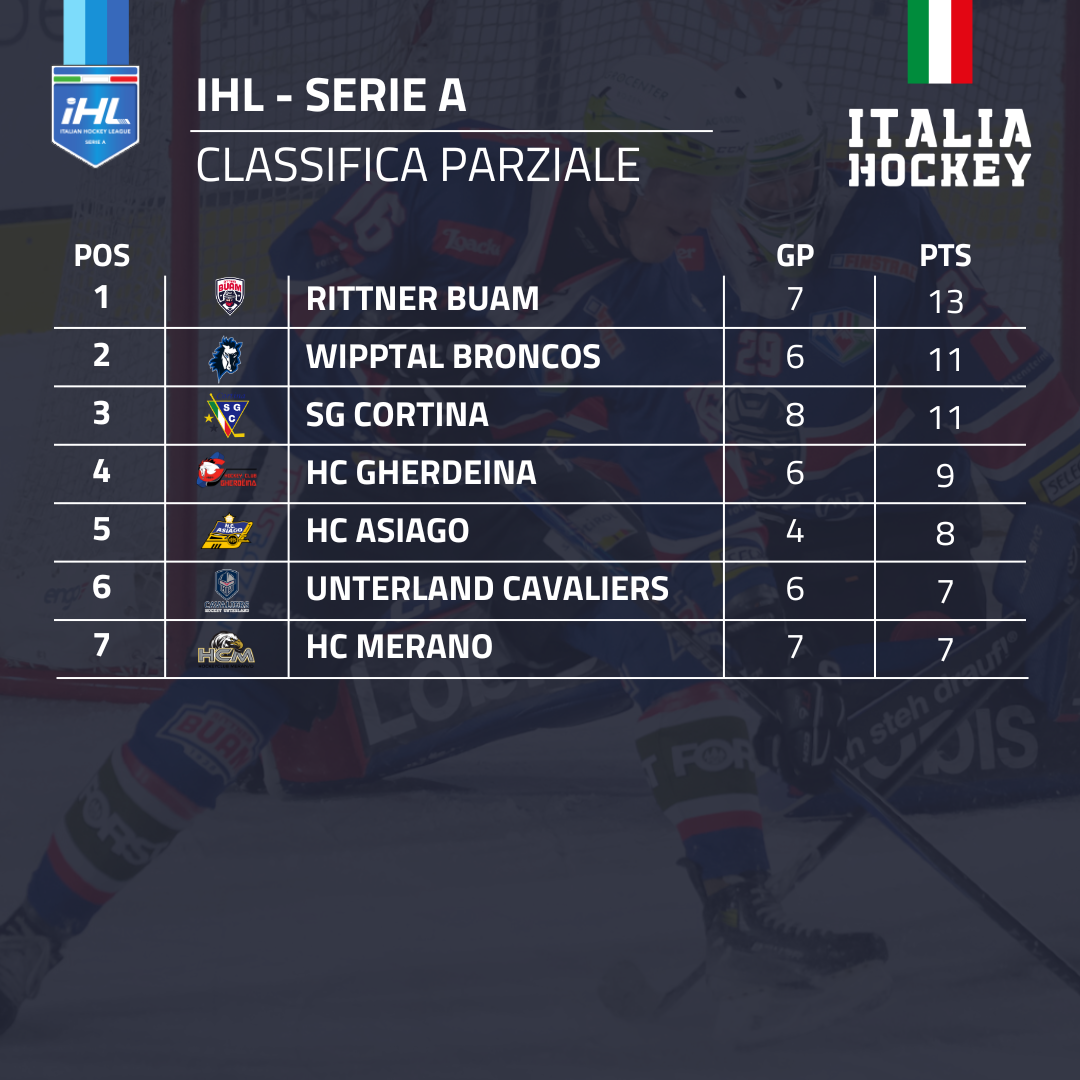 Al comando della IHL Serie A ci sono i Rittner Buam di Collalbo a quota 13 punti, nove dei quali raccolti nelle ultime quattro uscite tra vittorie nei 60’ e risultati finiti all’overtime o ai rigori. In seconda piazza ecco la coppia VipitenoCortina, entrambe a 11 lunghezze ma con una situazione leggermente diversa: i Broncos infatti hanno disputato sei match, gli ampezzani otto l’ultimo dei quali proprio contro la formazione altoatesina battuta 3-2 sabato all’Olimpico. Quarto, e al momento ultimo qualificato alla seconda fase per lo Scudetto (quella con semifinali e finali che assegnerà il titolo), c’è il Gherdeina a 9 punti e anch’esso a sei partite e con all’orizzonte una sfida importantissima proprio in casa del Cortina martedì 28 ottobre. Attenzione alla risalita dell’Asiago: i vicentini sono attualmente quinti con 8 punti, ma hanno disputato solo quattro partite per la IHL Serie A vincendo le ultime tre consecutive. Leggermente più indietro, ma ancora in corsa, Unterland (6 partite giocate) e Merano (7 match disputati), formazioni che complessivamente nelle ultime 10 sfide di campionato sono riuscite a imporsi in tre occasioni cedendo nelle altre sette.