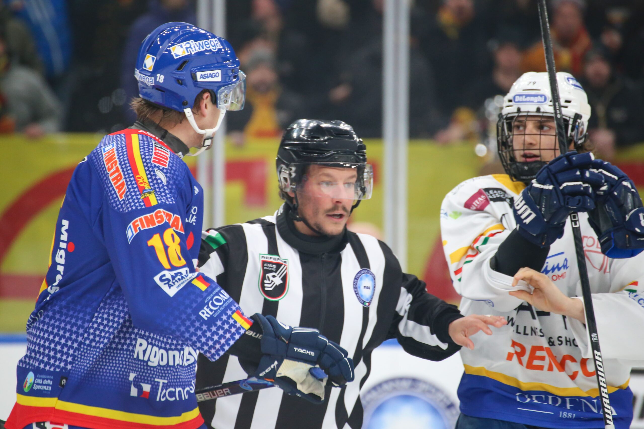 Il terzo periodo sin dal suo avvio è molto tattico, con le due squadre che non trovano facilmente spazi in una gara intensa, con pochissime pause e cambi costanti per tenere alto il ritmo. Nel computo generale delle occasioni è a lungo il Cortina a farsi preferire, con Sanna che in wrap around impegna Rigoni, bravo anche su Pompanin e Fortunato autori di due percussioni dalla sinistra. Gli stellati non stanno a guardare e si rendono pericolosi soprattutto in ripartenza costringendo la difesa avversaria a tanti blockshots mentre Karjalainen è super su Calisti che spara una gran conclusione dalla blu. Si entra negli ultimi 5’ ancora con l’Asiago avanti 2 a 1 e il Cortina che cerca disperatamente di creare un’occasione ma trova davanti un vero muro. Solo un tocco ravvicinato di Sanna spaventa Rigoni che chiude, e agli ampezzani non basta neanche giocare gli ultimi 120” senza goalie per impattare la sfida. La retroguardia dei vicentini non concede nulla e blinda il 2-1 che vale la finale Scudetto per l’Asiago che giocherà domenica alle 20.00. Alle 11.00 invece il Cortina disputerà la sfida per il terzo e quarto posto. Nel finale da segnalare qualche scaramuccia tra i giocatori delle due squadre con una penalità partita (5+20′) comminata a Kris Pietroniro.