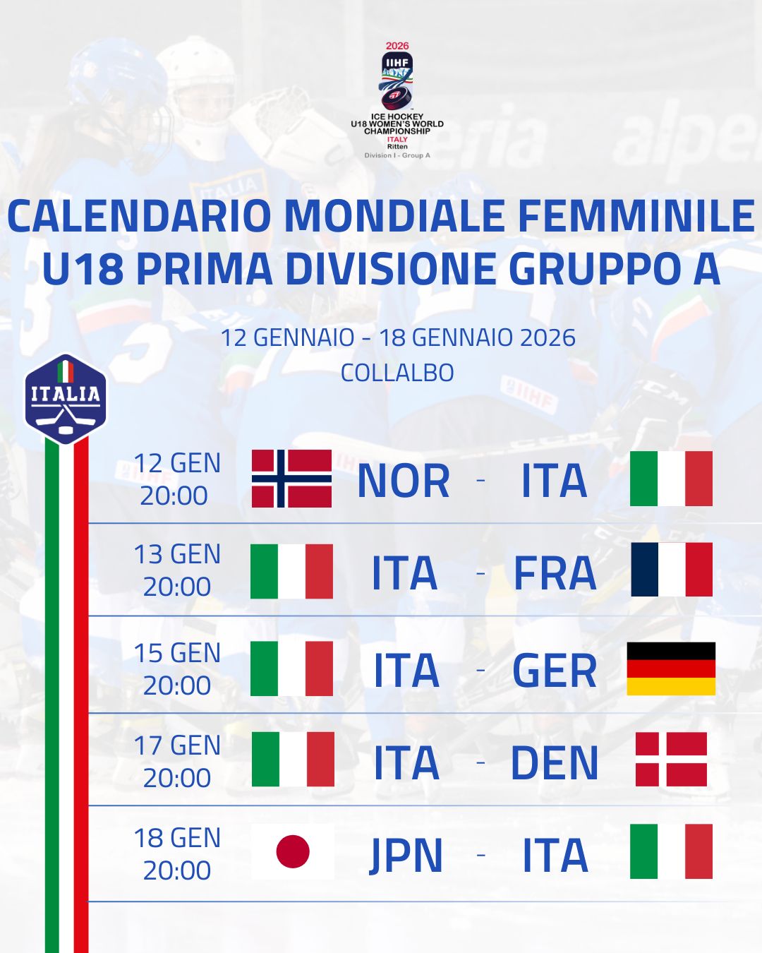 Tutto è pronto alla Ritten Arena di Collalbo per ospitare il Campionato Mondiale Under 18 femminile di Prima Divisione Gruppo A. La Nazionale italiana femminile Under 18 affronterà nell’ordine Norvegia, Francia, Germania, Danimarca e Giappone nella corsa alla promozione nella Top Division. Dal 12 al 18 gennaio, sul Renon, sono in programma 15 partite con la formula del girone all’italiana: ogni squadra disputerà cinque incontri. Da sottolineare che l’ingresso all’arena altoatesina sarà gratuita, e che tutti i match andranno in diretta su FISG.tv.