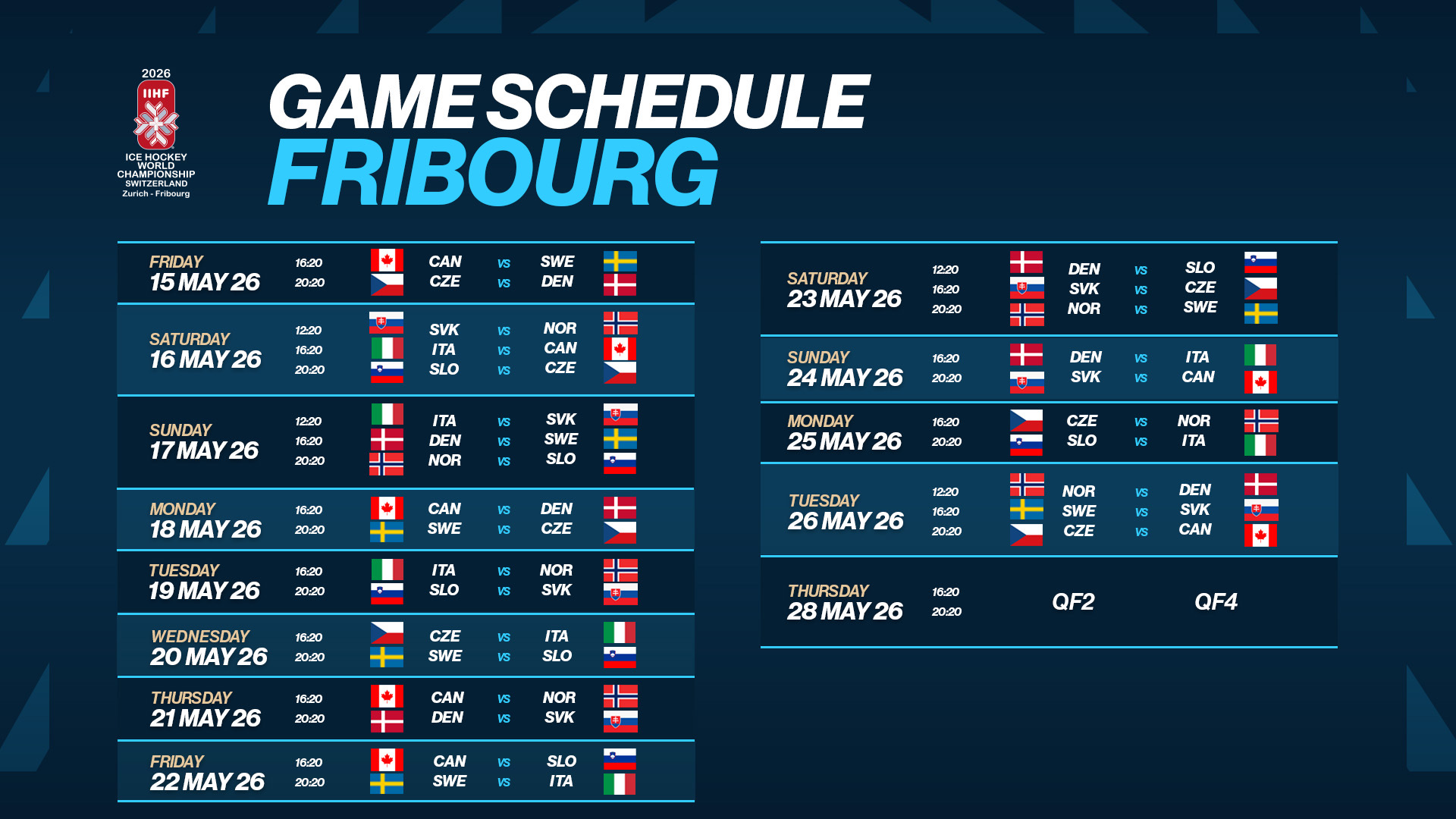 L’esordio sarà contro la formazione più carica di fascino, quel Canada che dopo due anni senza vincere l’oro iridato, parte sicuramente tra le favorite. Il giorno seguente sfida alla Slovacchia, replica di quanto accaduto alle Olimpiadi con gli azzurri capaci di lottare fino all’ultimo istante prima del k.o. per 3-2. Martedì 19 maggio terza partita contro la Norvegia, quindi il 20 e 22 maggio i duelli contro Repubblica Ceca e Svezia, altre due delle squadre dal curriculum più importante della manifestazione. Due giorni dopo ecco la Danimarca, grande sorpresa dell’edizione 2025 e capace di arrivare fino in semifinale, quindi la chiusura del girone prevista contro la Slovenia, affrontata tante volte anche nel recente passato.